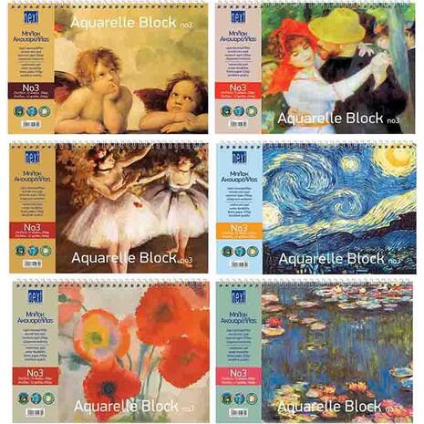 Μπλοκ Ακουαρέλας No3! Εντυπωσιακά εξώφυλλα με απίθανα σχέδια και μαγευτικά χρώματα, ζωντανεύουν την φαντασία κάθε επίδοξου καλλιτέχνη! Είναι κατασκευασμένα από ειδικό χαρτί που περιέχει βαμβάκι για την σωστή απορροφητικότητα της επιφάνειας του χαρτιού. Κατάλληλα για πινέλα, ξυλομπογιές, νερομπογιές, και λαδομπογιές.Διπλό Σπιράλ με 12 φύλλα. Διαστάσεις: 25x35cm. Περιλαμβάνεται 1 τεμάχιο από τα εικονιζόμενα. ΠΡΟΣΟΧΗ! ΠΩΛΟΥΝΤΑΙ ΞΕΧΩΡΙΣΤΑ ΣΕ ΔΙΑΦΟΡΑ ΣΧΕΔΙΑ η αποστολή θα γίνει σε τυχαίο σχέδιο.