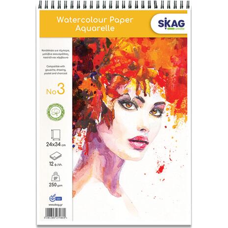 Μπλοκ Ακουαρέλας από την SKAG  !  Καλοσχεδιασμένα εξώφυλλα με εντυπωσιακά  σχέδια  και μαγευτικά χρώματα, ζωντανεύουν την φαντασία κάθε επίδοξου καλλιτέχνη!  Είναι κατασκευασμένα από χαρτί υψηλής ποιότητας ιδανικό για ζωγραφική με νεροχρώματα  για την σωστή απορροφητικότητα της επιφάνειας του χαρτιού.   Κατάλληλα για τέμπερα, μολύβια ακουαρέλλας, παστέλ και κάρβουνο. Διατίθεται σε 3 μεγέθη, σπιράλ με 12 φύλλα.