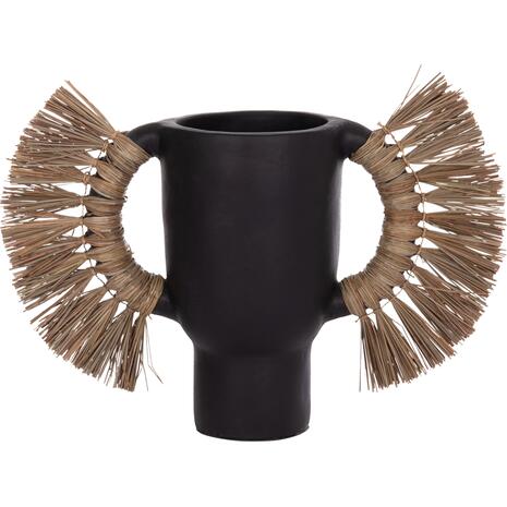 Το επιτραπέζιο χειροποίητο διακοσμητικό βάζο ALICA είναι ένα πολύ ιδιαίτερο διακοσμητικό στοιχείο για κάθε χώρο. Είναι κατασκευασμένο εξολοκλήρου από τερακότα σε ΜΑΥΡΟ χρώμα, ενώ διαθέτει και δύο χερούλια επενδυμένα με αποξηραμένο grass, και ένα φαρδύ στόμιο.