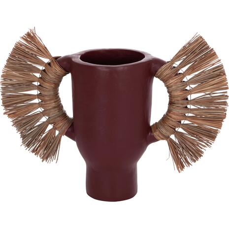 Το επιτραπέζιο διακοσμητικό βάζο ALICA είναι ένα πολύ ιδιαίτερο διακοσμητικό στοιχείο για κάθε χώρο. Είναι κατασκευασμένο εξολοκλήρου από τερακότα σε ΒΥΣΣΙΝΙ χρώμα, ενώ διαθέτει και δύο χερούλια επενδυμένα με αποξηραμένο grass, και ένα σχετικά φαρδύ στόμιο.