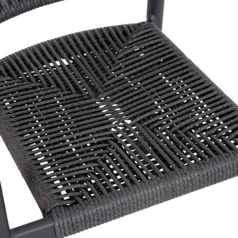 Η πλάτη και το κάθισμα της πολυθρόνας είναι από P.E. Rattan σε πλέξη. Δηλαδή, η πλέξη έχει γίνει με πολυεστερικές ίνες υψηλής ποιότητας και αντοχής ανθεκτικές σε ακραίες καιρικές συνθήκες ζέστης ή κρύου, που μοιάζουν με σχοινί.