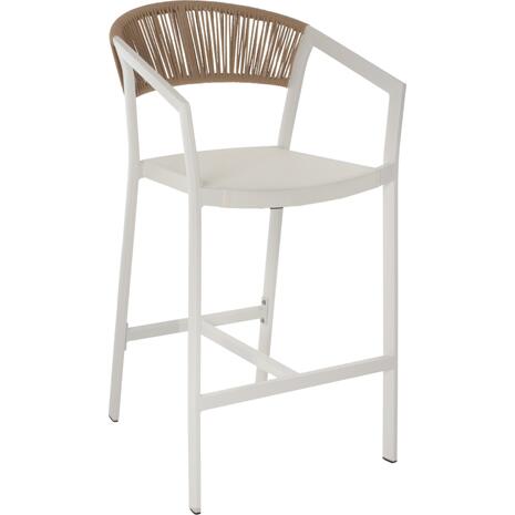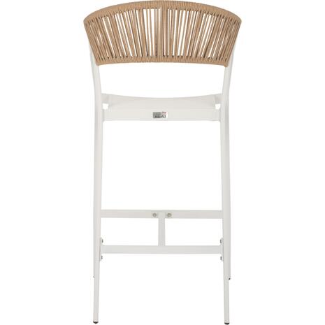 Η πλάτη του σκαμπό είναι επενδυμένη με πολυεστερικό RATTAN. Στα περισσότερα έπιπλα κήπου και γενικά σε έπιπλα για εξωτερικούς χώρους χρησιμοποιείται συνθετικό υλικό από PVC, δηλαδή τεχνητές ίνες υψηλής ποιότητας. Αυτό δίνει στην κατασκευή εξαιρετική αντοχή και ανθεκτικότητα σε ακραίες συνθήκες ζέστης ή κρύου.