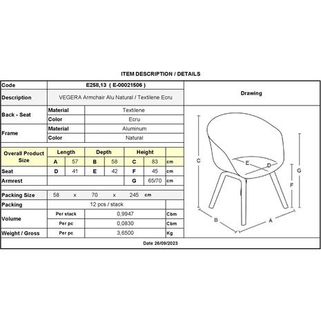 • VEGERA Πολυθρόνα Dining Αλουμίνιο Βαφή Φυσικό Textilene Εκρού, Στοιβαζόμενη (Ε258,13)