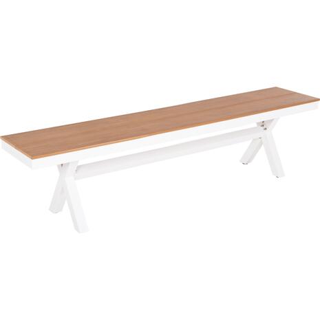 Το παγκάκι εξωτερικού χώρου TAWNEE έχει σκελετό αλουμινίου σε ΛΕΥΚΟ χρώμα, με δύο χιαστί βάσεις ενωμένες με μια οριζόντια φαρδιά ράβδο. Η επιφάνεια του καθίσματος είναι κατασκευασμένη από δύο πλάκες polywood σε χρώμα ΦΥΣΙΚΟΥ ΞΥΛΟΥ. Οι πλούσιες διαστάσεις του που άνετα βολεύονται 3 άτομα, το καθιστούν όμορφη και πρακτική προσθήκη για πληθώρα χρήσεων τόσο στο σπίτι, όσο και σε επαγγελματικούς χώρους.