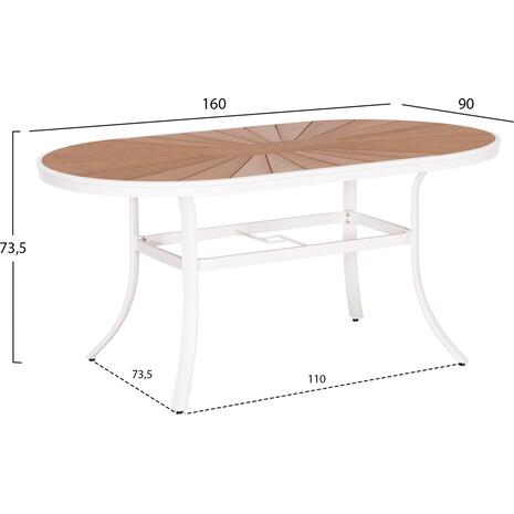 Το TELAMO είναι ένα οβάλ τραπέζι για εξωτερικούς χώρους με σκελετό αλουμινίου σε ΛΕΥΚΟ χρώμα. Η επιφάνεια είναι από πλάκες polywood σε ΦΥΣΙΚΟ χρώμα ξύλου. Πρόκειται για ένα τραπέζι σε κανονική διάσταση, που μπορεί να εξυπηρετήσει 6 τουλάχιστον άτομα.