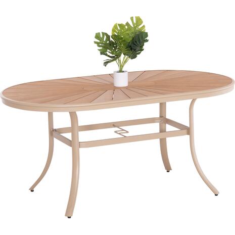 Το TELAMO είναι ένα οβάλ τραπέζι για εξωτερικούς χώρους με σκελετό αλουμινίου σε ΣΑΜΠΑΝΙ χρώμα. Η επιφάνεια είναι από πλάκες polywood σε ΦΥΣΙΚΟ χρώμα ξύλου. Πρόκειται για ένα τραπέζι σε κανονική διάσταση, που μπορεί να εξυπηρετήσει 6 τουλάχιστον άτομα.