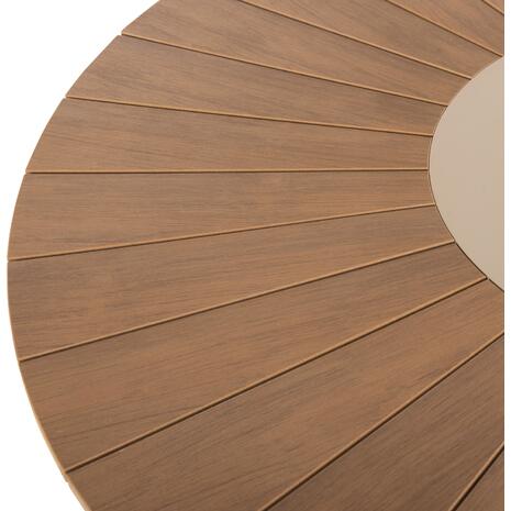 Το MORIL είναι ένα στρογγυλό τραπέζι για εξωτερικούς χώρους με σκελετό αλουμινίου σε χιαστί διάταξη βάσης και ΣΑΜΠΑΝΙ χρώμα. Η επιφάνεια είναι από πλάκες polywood σε ΦΥΣΙΚΟ χρώμα ξύλου. Πρόκειται για ένα όμορφο τραπέζι σε μεγάλη διάσταση, που μπορεί να εξυπηρετήσει 6 τουλάχιστον άτομα.
