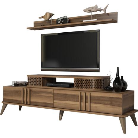 Το ΗΜ9515.02 είναι μια μοντέρνα και λειτουργική σύνθεση τηλεόρασης σε ΚΑΡΥΔΙ χρώμα, που θα ομορφύνει το σαλόνι σας! Αποτελείται από το κυρίως έπιπλο δαπέδου το οποίο διαθέτει 2 ντουλάπια, καθώς και 1 μακρύ ράφι τοίχου. Η ιδιαιτερότητα αυτής της σύνθεσης είναι ένα επιπλέον μικρότερο ράφι επάνω στο κυρίως έπιπλο με ανοιχτό χώρο τοποθέτησης συσκευών και με όμορφο σκαλιστό σχέδιο. Πρόκειται για μια κομψή πρόταση για το σαλόνι σας.