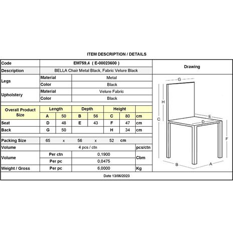 Καρέκλα Τραπεζαρίας - Κουζίνας BELLA Μέταλλο Βαφή Μαύρο, Ύφασμα Velure Απόχρωση Μαύρο [Ε-00023600] ΕΜ759,4 (4 τεμάχια).