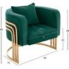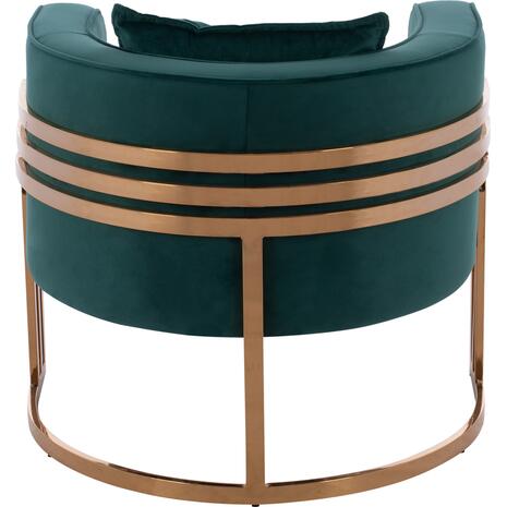 Η πολυθρόνα ΤΙΑΝΑ είναι μια πανέμορφη πολυθρόνα σε κυπαρισσί χρώμα και μεταλλικό σκελετό σε χρυσό χρώμα. Ο σκελετός καταλήγει στα πόδια της πολυθρόνας που είναι σε ημικυκλική διάταξη βάσης με 3 κάθετα σταθερά πάνω στο μεταλλικό ημικύκλιο. Μια καρέκλα που δίνει κάτι το ξεχωριστό σε οποιοδήποτε επαγγελματικό χώρο. Ξεχωριστή, ποιοτική και κομψή σίγουρα θα τραβήξει τα βλέμματα. Η πλάτη είναι χαμηλή αλλά συνοδεύεται από ένα μαλακό μαξιλάρι, ενώ όλη η πολυθρόνα έχει βελούδινη επένδυση με ρέλι στις ραφές, πράγμα που επιτείνει τον ιδιαίτερο χαρακτήρα αυτής της πολυθρόνας.