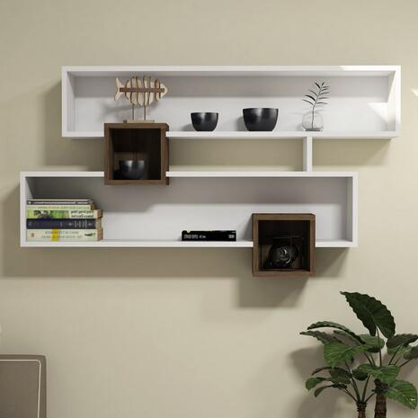 Ραφιέρα τοίχου από μελαμίνη σε λευκό χρώμα με καρυδί λεπτομέρειες.