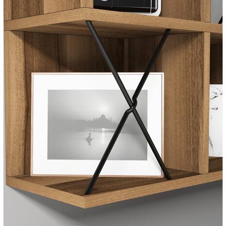 Το ράφι τοίχου μελαμίνης ΗΜ9520.02 σε ΚΑΡΥΔΙ χρώμα, συνδυάζει το απέριττο design με την πρακτικότητα. Αποτελείται από μια διάταξη 4 ραφιών σε μορφή κύβων, 2 εκ των οποίων έχουν και «πλάτη», με 2 μαύρα μεταλλικά Χ (βέργες) να προσφέρουν την μοντέρνα πινελιά στην κατασκευή.