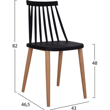 Τέσσερις καρέκλες με κάθισμα από πολυπροπυλένιο σε μαύρη απόχρωση και μεταλλικά πόδια με απόδοση στο φυσικό χρώμα του ξύλου.