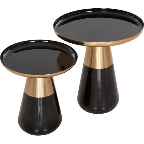 Το σετ 2 τραπεζιών OLUF για το σαλόνι είναι μια από τις νέες προσθήκες στην γκάμα μας. Πρόκειται για 2 μεταλλικά τραπεζάκια στρογγυλά με κωνική βάση σε ΜΑΥΡΟ γυαλιστερό χρώμα και ματ χρυσό χρώμα. Οι επιφάνειες είναι ΜΑΥΡΕΣ και έχουν χρυσή περίμετρο. Ιδανικά τόσο για το σπίτι, όσο και για επαγγελματικούς χώρους.