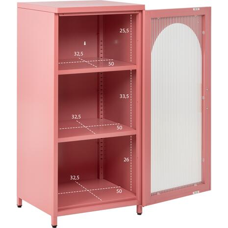 Το CARIL είναι ένα πρακτικότατο μεσαίου ύψους μεταλλικό ντουλάπι-βιτρίνα που έχει φτιαχτεί με γνώμονα την χωρητικότητα για το μέγεθός της και την ανθεκτικότητα. Έχει μία πόρτα με γυάλινο ραβδωτό τζάμι (βιτρίνα) και με χρυσό χερούλι ενώ το εσωτερικό είναι ένας χώρος με 2 ράφια που δημιουργούν 3 αποθηκευτικούς χώρους. Το χρώμα του ντουλαπιού είναι ΠΑΣΤΕΛ ΡΟΖ (λείο). Τα πόδια είναι χαμηλά και διαθέτουν ρεγουλατόρους ύψους για μεγαλύτερη ευελιξία στον χώρο που θέλετε να τοποθετήσετε το ντουλάπι.