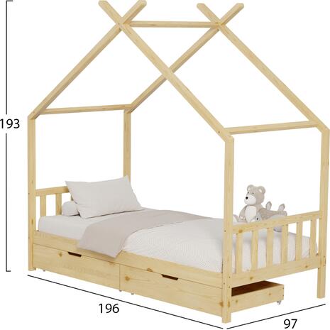 Σας παρουσιάζουμε το καινούργιο παιδικό κρεβάτι KLARICE τύπου Montessori που σημαίνει ότι έχει σχεδιαστεί σύμφωνα με το εκπαιδευτικό σύστημα Montessori, σύμφωνα με το οποίο τα παιδιά μαθαίνουν καλύτερα, όταν επιλέγουν μόνα τους τι θα κάνουν. Το χαμηλό ύψος κρεβατιού χωρίς πόδια, βοηθά να εξερευνούν την αυτονομία τους και να ανεβοκατεβαίνουν από το κρεβάτι τους ελεύθερα ανά πάσα στιγμή. Είναι σε διάσταση για μονό στρώμα 90x190 εκ, και αποτελεί μια άριστης ποιότητας, μοντέρνα και ασφαλή επιλογή για το παιδικό δωμάτιο. Είναι ξύλινο σε ΦΥΣΙΚΟ χρώμα βαμμένο με αβλαβές βερνίκι με βάση το νερό και μη τοξικό, ιδανικό για παιδιά. Το στρώμα τοποθετείται σε τάβλες κατασκευασμένες από ξυλεία κόντρα πλακέ. Ολόκληρο το κρεβάτι έχει σχήμα σπιτιού, που θα δώσει μια ευχάριστη, «ζεστή», και παιχνιδιάρικη όψη σε κάθε παιδικό δωμάτιο. Πέρα, όμως, από ευχάριστο στην όψη, αυτό το κρεβάτι είναι και πρακτικό αφού διαθέτει 2 μεγάλα συρτάρια στην κάτω πλευρά, για να αποθηκεύετε οτιδήποτε χρειαστεί.