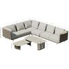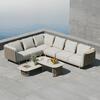 Το σετ σαλόνι 6τμχ εξωτερικού χώρου της σειράς NEXUS ανήκει και αυτό στην SYMETRON. Μια συλλογή από εξαιρετικές σειρές επίπλων που ανεβάζουν τον πήχη της ποιότητας και της αισθητικής που προσφέρουμε σε εσάς, τόσο για το σπίτι, όσο και για κάθε ανάλογο επαγγελματικό χώρο! Αποτελείται από 2 διθέσια κομμάτια, ένα μονό κομμάτι και ένα γωνιακό που δένει το σετ και του δίνει την μορφή της γωνίας. Φυσικά, το σετ ολοκληρώνεται με ένα τραπεζάκι 2 επιπέδων με sintered stone επιφάνειες κι ένα πρακτικότατο βοηθητικό τραπεζάκι μπράτσου με επιφάνεια από ξύλο teak που μπορεί να τοποθετηθεί και στις δύο άκρες της γωνίας. Ο σκελετός είναι από αλουμίνιο σε ΕΚΡΟΥ χρώμα με μαξιλάρια σε χρώμα ΜΠΕΖ. Το twisted wicker είναι άλλη μία πινελιά πολυτέλειας σε όλο το σετ και απογειώνει ποιοτικά όλη την σύνθεση!