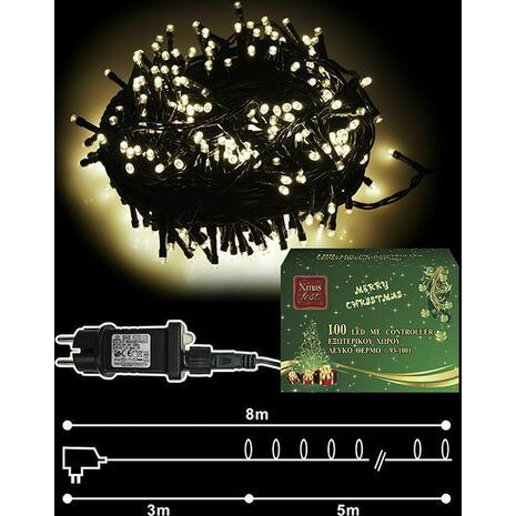 Χριστουγεννιάτικα λαμπάκια για εσωτερικό και εξωτερικό χώρο. 100 LED λευκά λαμπάκια με θερμό φως με controller 8 προγραμμάτων . Στη συσκευασία περιέχεται ο μετασχηματιστής.