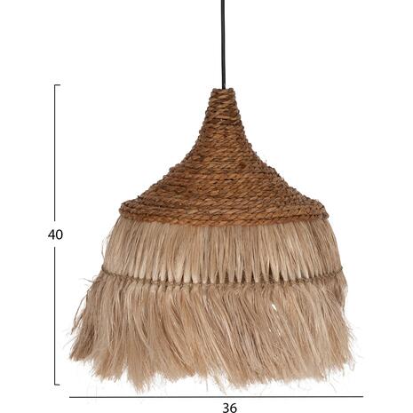Hm7753- Kρεμαστό φωτιστικό---- Αν επιθυμείτε να διακοσμήσετε το χώρο σας με ένα φωτιστικό σε boho στυλ, αυτό είναι η πιο σωστή επιλογή. Είναι ένα μονόφωτο φωτιστικό με «καπέλο» σε σχήμα καμπάνας φτιαγμένο από σκοινί από ίνες αμπακά. Το ιδιαίτερο χαρακτηριστικό, όμως, αυτού του φωτιστικού είναι ότι το «καπέλο» στο μεγαλύτερο μέρος του αποτελείται από κρόσια, επιτείνοντας ακόμα περισσότερο το boho στυλ.