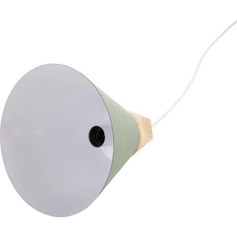 Ανακαλύψτε αυτό το νέο μας κρεμαστό φωτιστικό οροφής και ολοκληρώστε την διακόσμησή σας. Πρόκειται για ένα φωτιστικό με ΠΡΑΣΙΝΟ μεταλλικό καπέλο σε σχήμα καμπάνας με λεπτομέρεια ξύλου στην κορυφή του φωτιστικού. Αισθητικά, ολοκληρώνεται με το λευκό καλώδιο κρέμασης και την λευκή βάση οροφής, και αποτελεί την τελευταία τάση στα φωτιστικά οροφής.