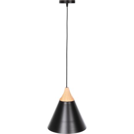 Ανακαλύψτε αυτό το νέο μας κρεμαστό φωτιστικό οροφής και ολοκληρώστε την διακόσμησή σας. Πρόκειται για ένα φωτιστικό με ΜΑΥΡΟ μεταλλικό καπέλο σε σχήμα κωνικής καμπάνας με λεπτομέρεια ξύλου στην κορυφή του φωτιστικού. Αισθητικά, ολοκληρώνεται με το επίσης ΜΑΥΡΟ καλώδιο κρέμασης και την μαύρη βάση οροφής, και αποτελεί την τελευταία τάση στα φωτιστικά οροφής.