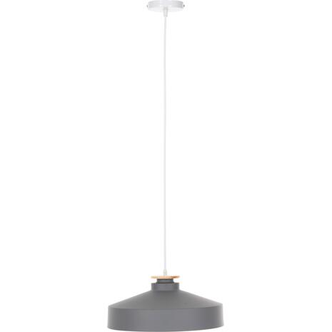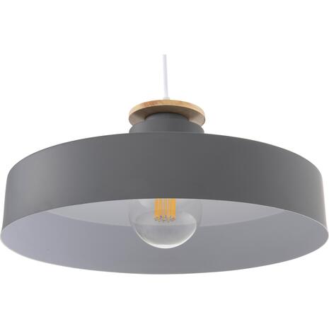 Ανακαλύψτε αυτό το νέο μας κρεμαστό φωτιστικό οροφής και ολοκληρώστε την διακόσμησή σας. Πρόκειται για ένα φωτιστικό με ΓΚΡΙ ρηχό μεταλλικό καπέλο σε σχήμα καμπάνας με λεπτομέρεια ξύλου στην κορυφή του φωτιστικού. Αισθητικά, ολοκληρώνεται με το λευκό καλώδιο κρέμασης και την λευκή βάση οροφής, και αποτελεί την τελευταία τάση στα φωτιστικά οροφής.