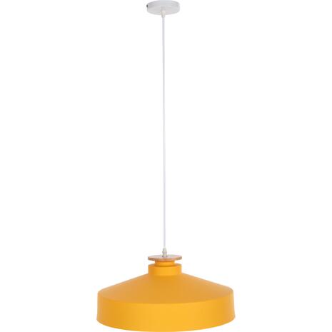 Ανακαλύψτε αυτό το νέο μας κρεμαστό φωτιστικό οροφής και ολοκληρώστε την διακόσμησή σας. Πρόκειται για ένα φωτιστικό με ΚΙΤΡΙΝΟ ρηχό μεταλλικό καπέλο σε σχήμα καμπάνας με λεπτομέρεια ξύλου στην κορυφή του φωτιστικού. Αισθητικά, ολοκληρώνεται με το λευκό καλώδιο κρέμασης και την λευκή βάση οροφής, και αποτελεί την τελευταία τάση στα φωτιστικά οροφής.