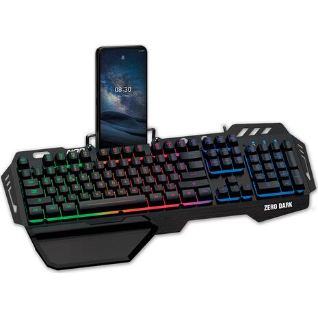 Το ενσύρματο gaming πληκτρολόγιο ZERO DARK έχει εντυπωσιακή, total black εμφάνιση με επιφάνεια από βαμμένο μαύρο αλουμίνιο και ταυτόχρονα εργονομική σχεδίαση για πολύωρη χρήση. Επιπλέον διαθέτει XL αποσπώμενη επιφάνεια στήριξης καρπού που του προσδίδει aggressive εμφάνιση καθώς και βάση στήριξης για το smartphone σου για να είναι πάντα στο οπτικό σου πεδίο
