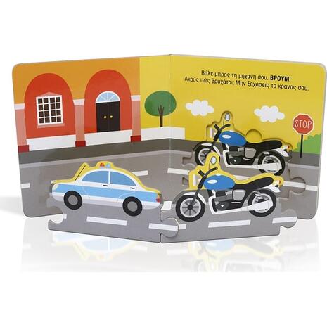 Πάρτε θέση, βάλτε ζώνη και κράνος, και γνωρίστε πολλά απίθανα οχήματα της πόλης. Ύστερα ενώστε τα 5 κομμάτια παζλ με τη σειρά που προτιμάτε. Οι συνδυασμοί είναι τόσο πολλοί! Στο τέλος, φυλάξτε τα πίσω στη θέση τους μέχρι το επόμενο παιχνίδι.